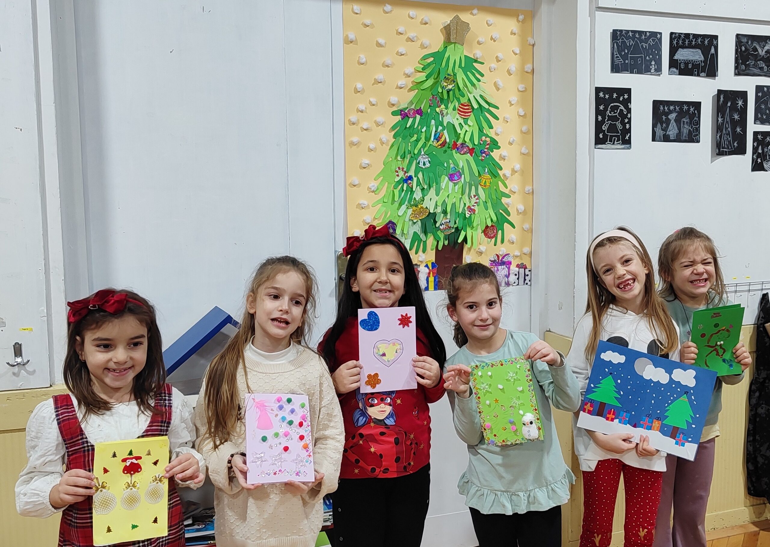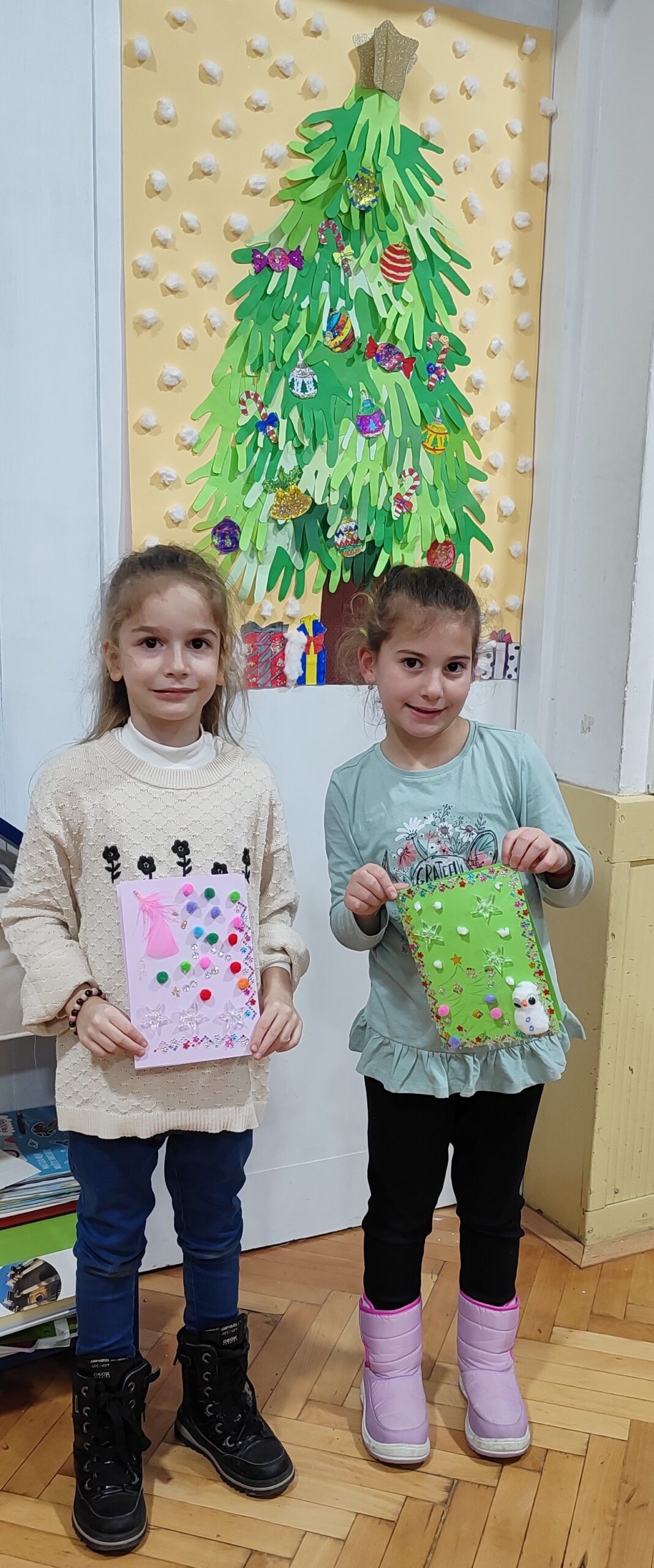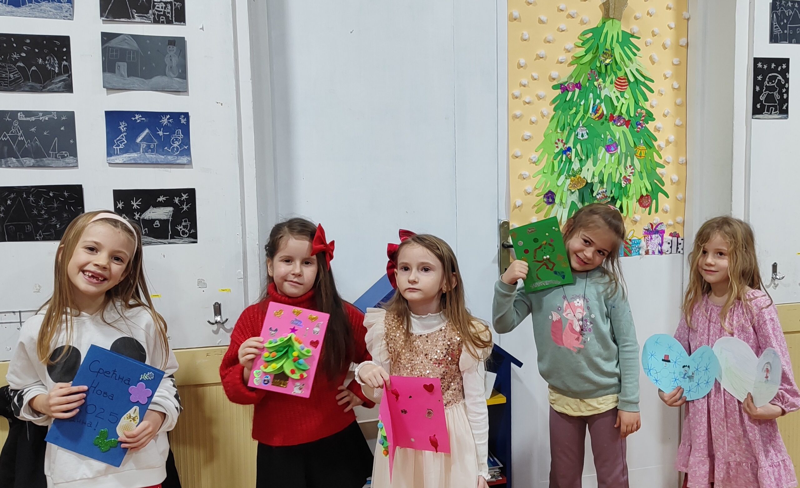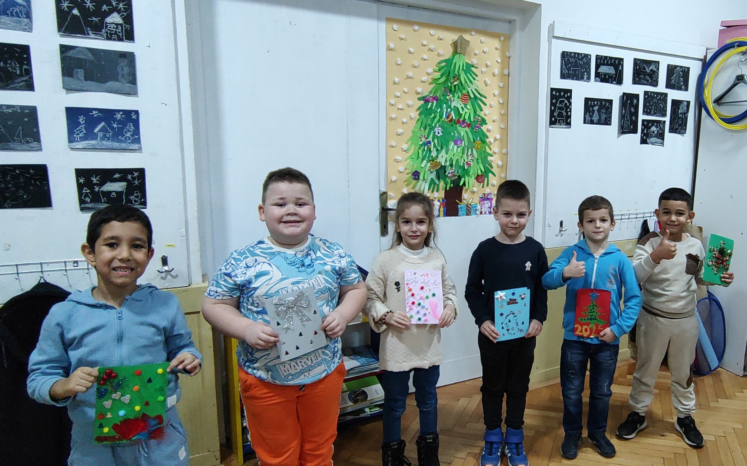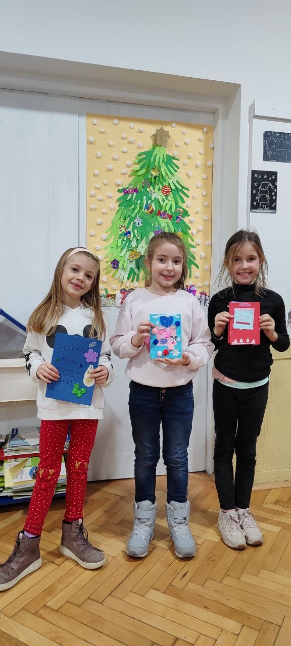 Креативна радионица у сарадњи са родитељима одржана је у учионици предшколаца, на тему „Новогодишње честитке“. Од материјала смо користили хамер у боји, материјале за рециклажу, разне налепнице, лепак, шљокице и слично.