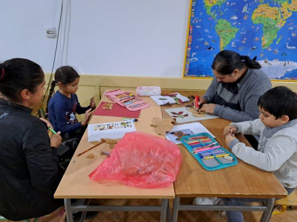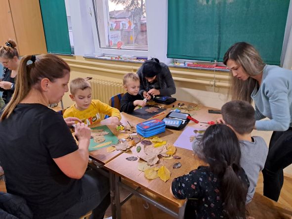 Инспирисани бојама и облицима јесењег лишћа, у сарадњи са родитељима предшколаца, реализовали смо  креативну радионицу „Јесењи колаж“. Користећи јесење лишће, охо лепак, пластичне очи и фломастере, правили смо слике животиња. И деца и родитељи су веома уживали у стварању јесењих слика као и у међусобном дружењу. Ово је била одлична прилика и да се родитељи деце међусобно упознају као и да покажу своје креативно умеће. Радионица је одржана у уторак, 25.10.2023. године, од 17-18 часова у учионици предшколаца.